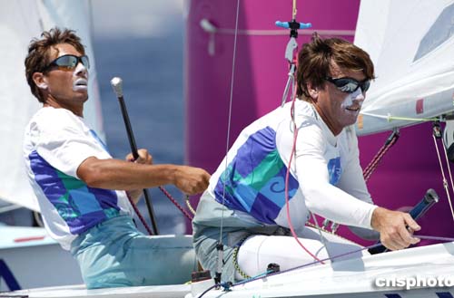 图为当地时间8月18日举行的男子双人皮划艇比赛中,美国选手Paul Foerster和Kevin Burnham。