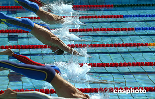 图为在当地时间8月19日举行的游泳比赛中,各选手入水瞬间。