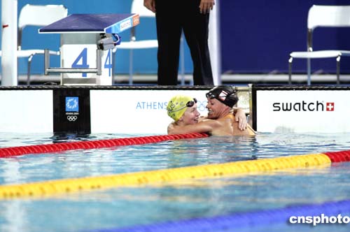 图为在当地时间19日举行的女子自由泳100米比赛后,荷兰选手Inge de Bruijn拥抱获得冠军的澳大利亚选手Jodie Henry以示祝贺。