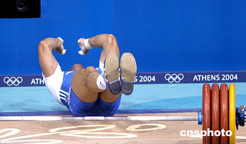 在当地时间8月19日举行的男子77公斤级比赛中,希腊选手维·米特鲁试举失败后人也仰倒在地。
