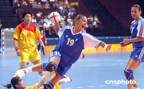在当地时间8月19日举行的女子手球比赛中,中国队以34比13战胜东道主希腊队,挺进四强。图为希腊选手在比赛中射门时的一个镜头。