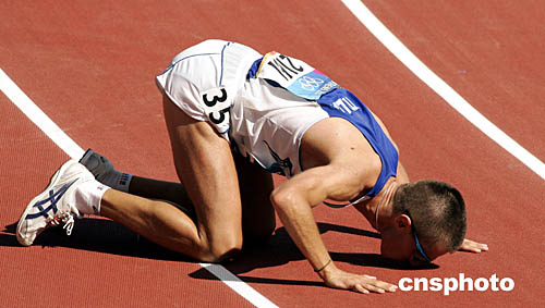图为意大利选手布鲁格内蒂在赢得男子20公里竞走冠军后亲吻大地的场面。