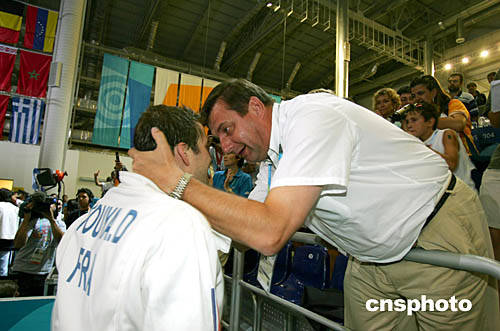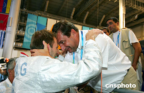 图为在法国队夺取男子配剑团体冠军后,法国体育部长拉穆尔拥抱选手的场面。
