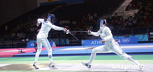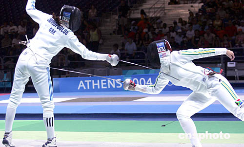 图为在当地时间8月20日举行的女子击剑比赛中,希腊选手和南非共和国选手展开激烈对攻。