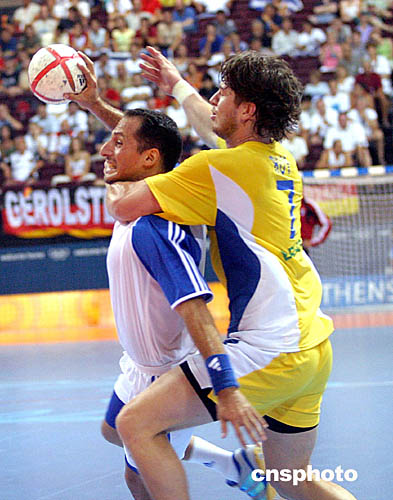图为在当地时间8月20日举行的男子手球比赛中,巴西队与希腊队比赛的场面。最后巴西队22比26不敌希腊队。