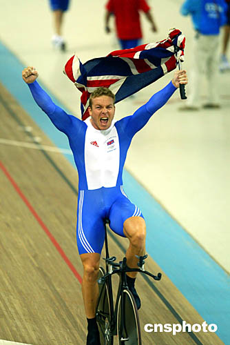图为在当地时间8月20日举行的男子自行车1公里计时赛决赛后,夺冠的英国选手豪伊(Chris Hoy)高举国旗欢呼胜利的场面。