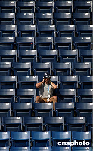 图为在当地时间8月20日举行的女子50米自由泳比赛中,偌大一个看台只有一名观众。