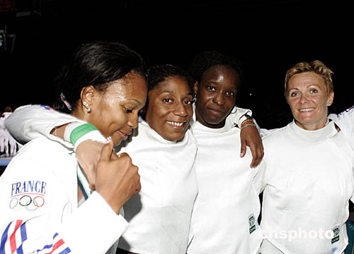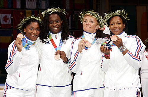 在女子重剑团体比赛中夺得铜牌后,法国队员们登上领奖台露出灿烂的笑容。
