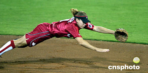 图为在当地时间8月19日举行的加拿大和澳大利亚垒球比赛中,加拿大选手的精彩表现。