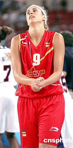 图为当地时间8月20举行的女子篮球赛中,西班牙队员在球队不敌美国队后扼腕痛惜。