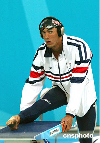 图为获得男子100米蝶泳冠军的美国选手菲尔普斯(Michael Phelps)在做赛前准备活动。