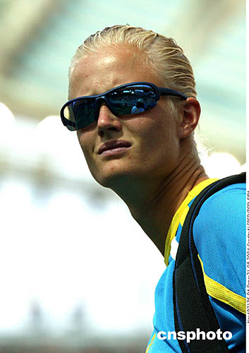 图为瑞典名将克鲁夫特(Kluft Carolina)参加比赛时的照片。最后他荣获女子七项全能赛冠军。