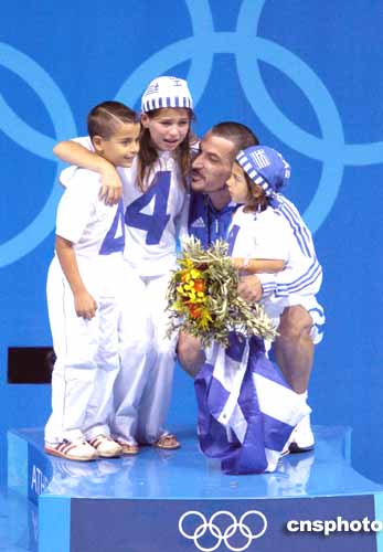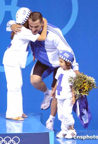 图为当地时间21日进行的男子85公斤级举重比赛中,铜牌得主希腊选手迪马斯与他的孩子们一起分享胜利的喜悦。