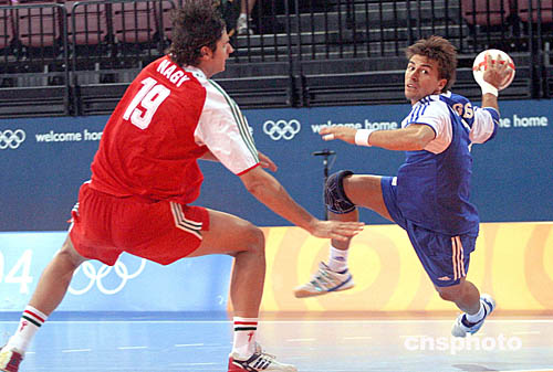 在当地时间8月22日举行的男子手球赛中,匈牙利队以26比22战胜希腊队。图为匈牙利队的19号选手Laszlo Zoltan NAGY。