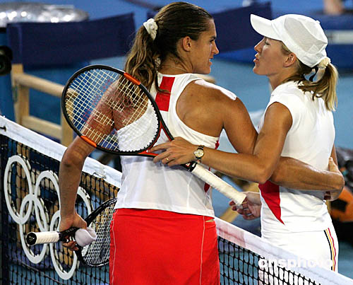 在当地时间8月21日举行的女子网球赛中,比利时小将海宁战胜法国名将毛瑞斯莫折桂。图为赛后两名选手非常友好的拥抱。