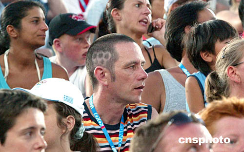 图为一名观众的头上剃了个奥运五环的图,非常醒目。