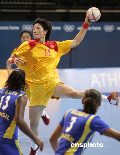 当地时间8月23日下午,在雅典奥运女子手球比赛中,中国女子手球队(黄)以28比23力克巴西队。中新社记者:张炜