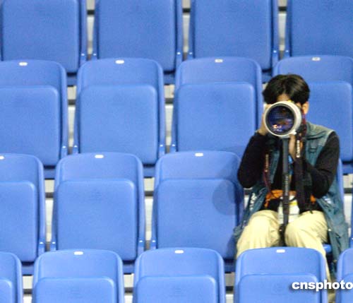 图为当地时间23日进行的男子94公斤级举重赛场上的摄影者。