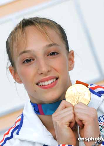 在当地时间23日进行的女子体操个人器械比赛中,霍尔金娜出现重大失误,法国选手勒配内奇取得高低杠项目的金牌。图为她向观众展示金牌的镜头。