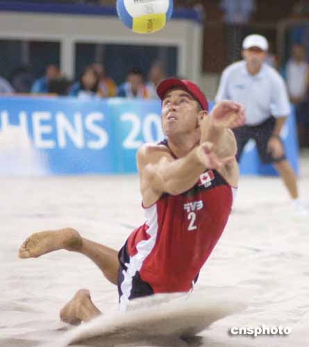 图为在当地时间8月21进行的沙滩排球赛中,运动员飞身救球的场面。