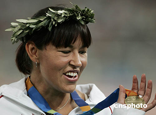 图为加拿大选手贝蒂克勒克(CHANTAL PETITCLERC)获得奥运会女子800米轮椅冠军后展现金牌的镜头。