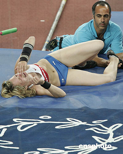 图为俄罗斯选手ANASTASIYA IVANOVA在撑竿跳比赛时腿部受伤时的画面。