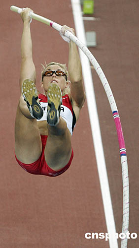 图为加拿大选手DANA ELLIS在女子撑高跳比赛中的画面。