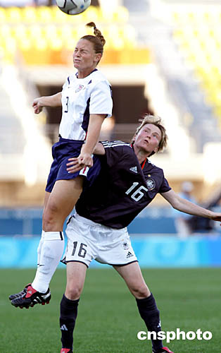 图为在当地时间8月23日的女足比赛中,美国队3号选手Christie RAMPONE头球出色。