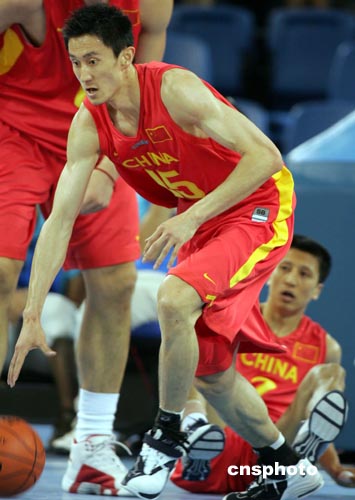 中国男篮在雅典奥运会小组赛最后一场比赛中以一分险胜世界冠军塞黑队闯入前八名,以替补大前锋出战的杜锋(15号球衣)表现喜人,在最后关头锁定胜局。中新社记者:任晨鸣