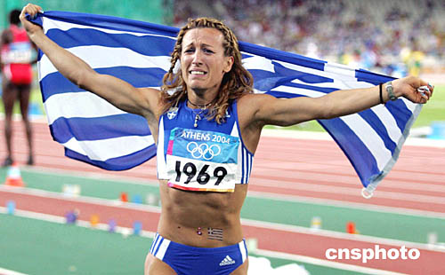 图为希腊选手Hrysopiyi DEVETZI在获得女子三级跳远亚军后庆祝的场面。