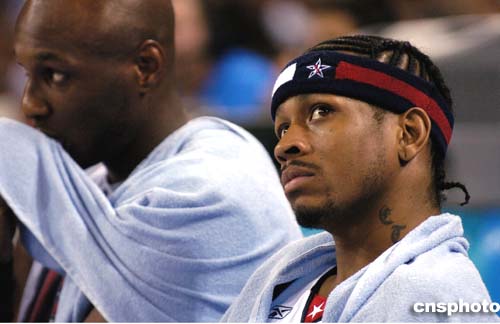 图为在当地时间23日举行的篮球预赛中,美国主力球员艾弗森被换下场休息,但他仍紧紧关注着场上形势的变化。