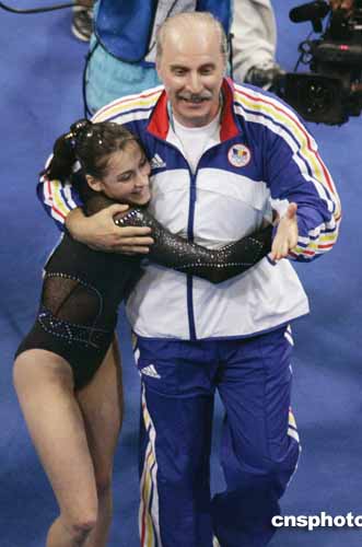 图为当地时间23日,罗马尼亚选手卡-波诺获得平衡木比赛冠军后拥抱她的教练的镜头。