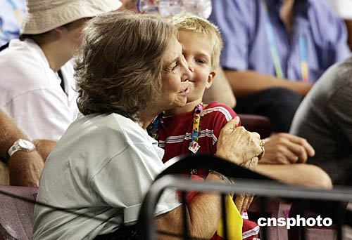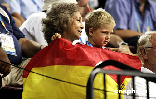 图为西班牙皇后索菲亚与她的孙子在观看西班牙队和德国队的手球比赛。