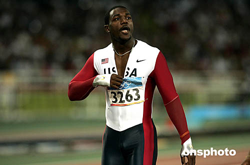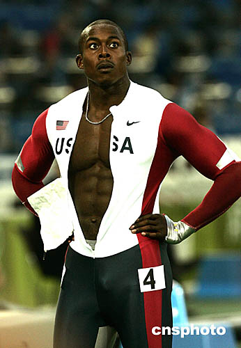图为美国选手克劳福德(CRAWFORD Shawn)和加特林(Justin Gatlin)在男子200米预赛中,冲过终点后向左看积分牌的镜头。