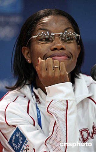 加拿大选手费利西安(Perdita Felicien)在雅典奥运会田径女子100米栏决赛中跨第二个栏时摔倒,没有完成赛程。图为她出席记者会时的镜头。