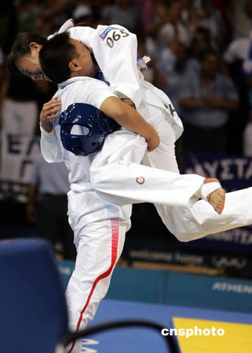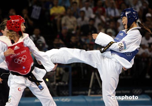 当地时间8月28日晚,在雅典奥运会跆拳道女子67公斤级决赛中,中国选手罗微击败希腊选手获得冠军。中新社记者:任晨鸣