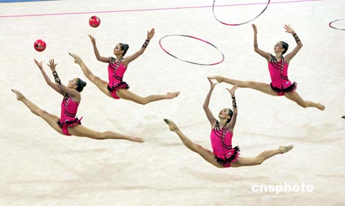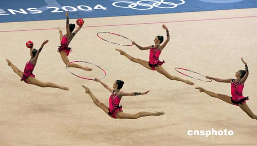 雅典时间8月28日,2004年奥运会艺术体操决赛在雅典举行,俄罗斯队以51.100分的最高分夺得冠军。中新社记者:王瑶