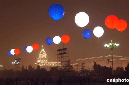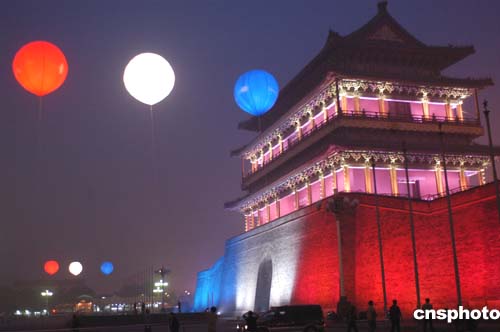 正当法兰西共和国总统希拉克对中国进行国事访问之际,及中法文化年将进入第二个阶段——中国举办“法国文化年”一系列活动之时,十月九日下午六时许,北京天安们广场南侧正阳门楼披上象征法国国旗红白兰三色艳丽灯光,八组二十四盏千瓦红白兰灯光彩色气球环绕天安门广场,营造出一派中法友谊欢乐景象。在十月十日,法国文化年将在中国将正式拉开帷幕。作者:邹宪