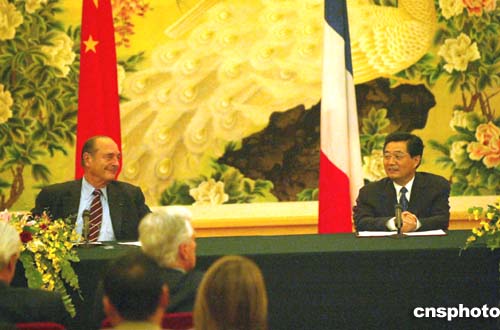 希拉克表示,完全赞同胡锦涛对进一步发展两国全面战略伙伴关系的四点建议,强调法方愿同中方共同努力,不断加强法中在各个领域的友好合作。