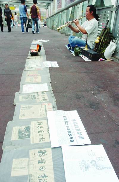他面前的地上除了用来卖艺的萨克斯管、巴乌、唢呐、笛子和葫芦丝,还有20多份摊在地上的报纸剪报,剪报的内容全都是包括《华西都市报》《重庆晚报》在内的山东、四川等地地方报纸对他的相关报道。