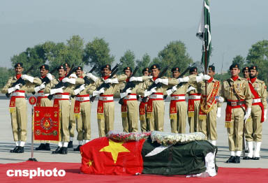 巴基斯坦礼兵抬着王鹏的灵柩走向专机
