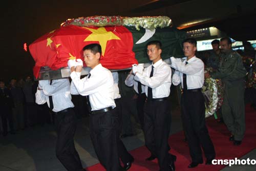 中新社济南十月十六日电 (记者 王鲁平 胡洪林)在巴基斯坦人质绑架事件中遇难的中国工程师王鹏遗体,今晚八点四十五分由巴基斯坦的专机运回,抵达山东省济南国际机场,中国外交部、商务部、山东省人民政府等有关部门的官员在济南机场举行庄严的灵柩迎接仪式。