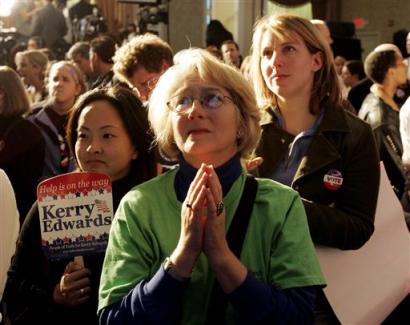 中新网11月3日电 据美联社报道,美国东部时间2004年11月2日(北京时间11月3日),在宾西法尼亚州东南部城市费城举行的美国民主党宾州总部选举集会上,民主党总统候选人克里的支持者神情焦虑,十分紧张地盯着大厅里的计票牌。站在最前面的绿衣金发妇女双手合十,在心中默默在为克里祈祷,希望他能够获得今年的总统大选。(固山)