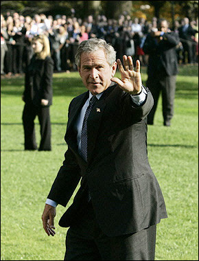 中新网11月3日电 据法新社报道,11月2日,在奔波了数州拉票之后,布什总统乘坐“海军陆战队一号”直升机回到白宫,等待选举结果。图为布什下机之后,向民众挥手致意,脸上充满了疲倦,但也显示出他的自信。(春风)