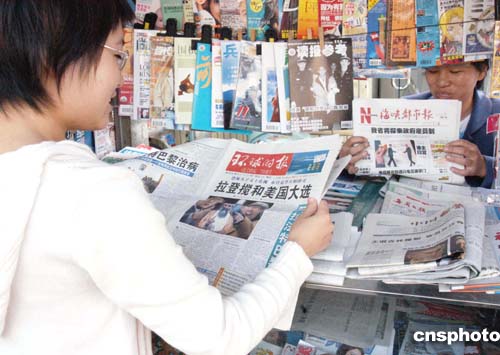 十一月三日是美国二00四年大选投票日,福州一名在校女大学生在市区街头报摊阅读国内多家报刊有关新闻,关注美国选情。作者:刘可耕