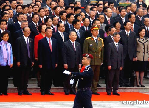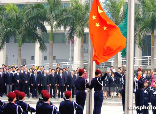 澳门特别行政区行政长官何厚铧、解放军驻澳门部队司令员刘联华20日上午出席庄严的升旗仪式,庆祝澳门回归祖国五周年。作者:宋吉河