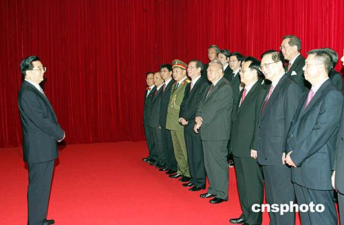 十二月二十日上午,胡锦涛在澳门文化中心会见香港特区政府官员,并在合影后发表讲话。作者:宗金柱