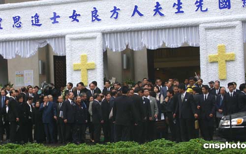 仪式于上午八时举行,堂内挂满白纱帷幕和白色鲜花,场面肃穆。与蒋家关系密切的牧师周联华现场引用旧约圣经篇章“才德的妇人”诵扬蒋方良一生温良恭俭让美德。