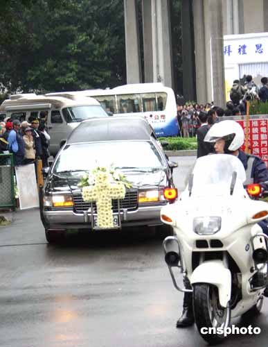 十时半,乐队奏起哀乐,蒋家长孙蒋友松手拿祖母的遗像,蒋友柏持白色鲜花十字架在前引领,装有蒋方良遗体的棺木被抬出。