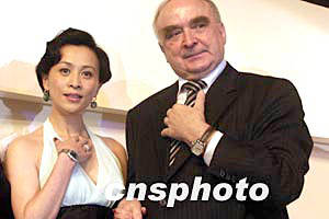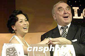 五月十三日晚,刘嘉玲现身北京,为瑞士斯沃琪公司旗下的著名手表品牌经典“浪琴表典藏”系列助兴。图为刘嘉玲(左)与浪琴表全球总裁霍凯诺(右)展示新款手表。作者:高远